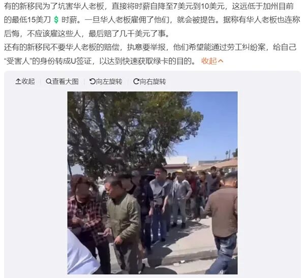 又是“同胞坑同胞”……但这次还得说,原因有两点:一,坑同胞的同胞坑同胞的思路堪称“一招制敌”,不过,“聪明得有点儿过了头”;二,被同胞坑的同胞之所以能被坑,明显是其“常年顽疾”所致,纯属“占便宜没够吃大亏”……本文提醒华胞们,不论是打工者,还是老板,都该检点一些!近一年来,美国无证移民越来越多。根据美国海关及边境保护局(CBP)数据,今年头3个月在南部边境被拦截的人数是去年同期的两倍。这么多同胞来美却“无证”,自然要找份“黑工”活下去。因此,对语言能力要求较低的华人餐饮业便成了他们的首选。这也就是本文要说的“内幕”,一种新的坑人手法,名曰“降薪圈套”。一位匿名知情者介绍说,华人聚集的纽约市法拉盛和洛杉矶丁胖子广场最近来了很多应聘的餐馆打工者。由于竞争激烈,一些人主动提出降薪——原来一天的工钱是120-130美元,现在已被人主动喊到80美元,甚至50美元……一些华人老板挺高兴,“这也太省钱了!”……于是便请了这些人。但怎料,麻烦随之而来。知情者称,这些主动要求降薪打工的人,一拿到工资就变脸,转身就向劳工局举报,说“受到了某位华人老板的剥削”。关键点来了——有一种说法在这些无证移民中盛传:一旦劳工局受理该纠纷案,该名无证移民/劳工就能以受害者的身份获得合法的移民批文。知情者说,这种坑人手法已是不公开的秘密,一位博主甚至在短视频平台手把手地教授别人如何操作这种““降薪圈套”。“一些无证移民嫌刷碗累、搬砖苦,听说这种方法可以讹到钱,还可能获得移民身份,于是便纷纷下水……他们就只做一两天的工,甚至只做几个小时,只要拿到钱,转身就举报……”知情者叹道,“现在,华人老板已不敢雇佣所有新来的华人移民,这等于把其他愿意辛苦干活的华人新移民的生路全都给堵死了。”对于此乱象,有华人律师表示,“只有遭到刑事迫害的人才有可能以受害者的身份获得U签证合法留美,劳工纠纷案对此不适用,该做法并不会加速劳工局的移民审理进程。”值得一提的是,此事并未赢得网友一边倒的支持或批判……因为没法说,两边儿似乎都不对。在一些地区,“华人老板”已成为“偷税漏税”,“剥削华工”的代名词,相关新闻层出不穷。在上述“坑人骗局”中,如果华人老板不先违反劳工法,以低于最低工资的标准去招工,那就绝不会有后面这些麻烦。律师提醒说,只要雇主合法合规地发放工资,不剥削员工,就不会有问题。律师同时提醒劳工,“降薪圈套”未必可行,建议相关无证移民在揭发老板之前之前咨询专业法律人士,避免得不偿失。华人老板被告被罚款,并视所有华人新移民为洪水猛兽……而无证移民,首先拿不到移民身份,其次还会面临被遣返或者被监禁的风险……这是图啥呢?