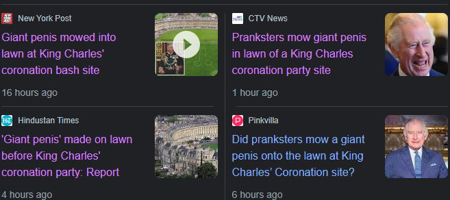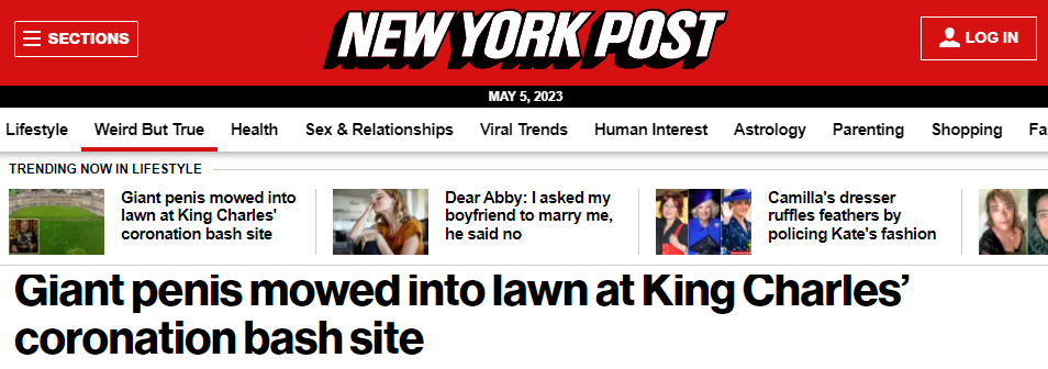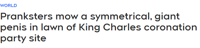 回到国王加冕礼的盛大派对。据悉,派对请帖上写着:“庆祝格鲁吉亚时代300周年!装饰您的皇冠!观看皇家派对!参观格鲁吉亚厨师烹制的美味!”这门“大炮”的占地面积实在是太大了,约有9米多高……根本让人无法忽视,所以,不处理肯定是不行的。由于明天周六上午11点就是查尔斯国王的加冕礼……本来万事俱备,可现在却得赶紧撤“炮”……这时间,确实相当紧迫……用耙子耙?上割草机?似乎都不得劲儿,唯一靠谱的办法就是把这片草皮全部换掉……还得是高级的,起码颜色不能跑偏。在加冕礼之前搞定……其实时间算来可能也差不多……然而,英国以及国王“已经糗了”……因为现在,全球大小媒体的头版加上自媒体,报的全是这个……换句话说,草坪能换,人的记忆无法清零,英国王室的脸已经丢完了……绝对没商量,各路大小媒体这次的思路相当整齐划一,草坪上大炮的照片哪个角度的都有……大家似乎一致认为,今次这条新闻,完全不属于“下三路的花边儿”,而是一个“与举世瞩目的英国国王加冕礼密不可分的重要的罕见突发事件”……除了大炮图到处都是,CTV新闻,你也是,你到底还算不算个正经媒体?您这题目起得也太直白了吧!——《恶作剧者在查尔斯加冕典礼草坪上割出神秘的巨大阴茎》……