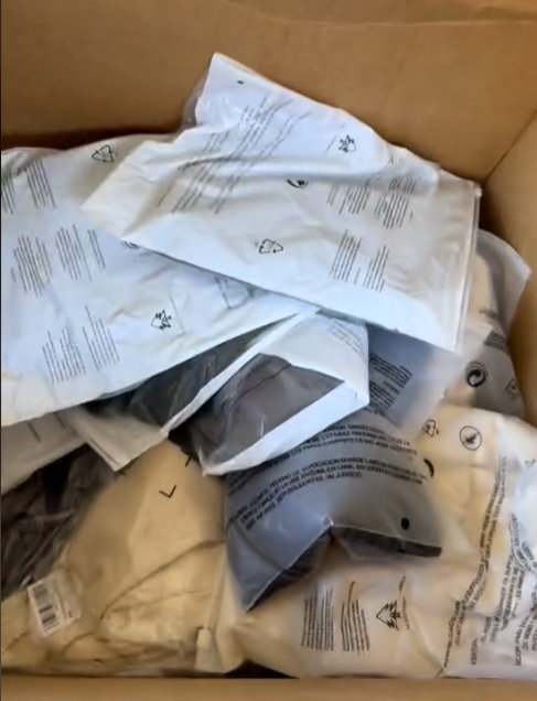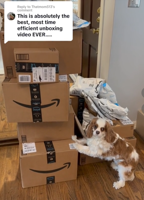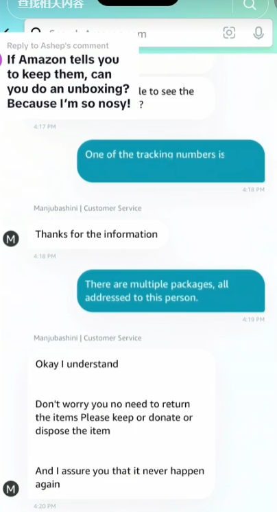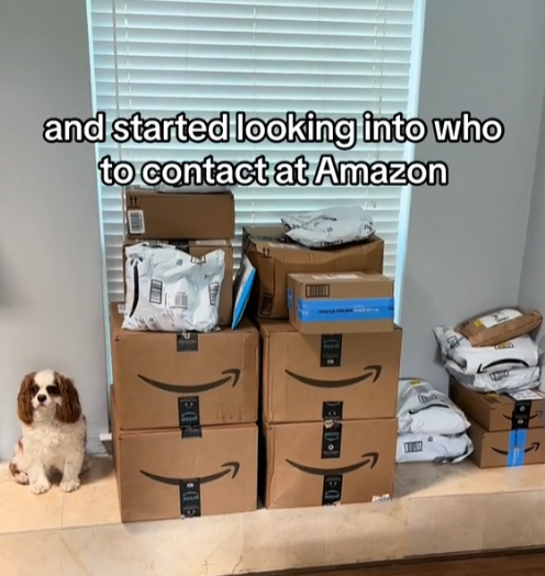 这些包裹上的收件地址确实写的是她的地址,但名字却不是她,而且她跟这收件人也完全不认识。接连收到这么多快递,Abbey有点慌,她担心会被亚马逊控告欺诈。她赶紧联系亚马逊,但打了两次电话都没能接通。妹子无奈录了视频,放在TikTok上求助。此前亚马逊错送包裹的事儿也经常发生,但是这一次一下子运错了41个实属罕见,这条视频一下子引起了6百万的观看。一天之后,Abbey称她通过网上聊天的方式已经收到了亚马逊客服的回复,对方称不需要她退还这些包裹了,她可以自留或者捐赠。得到了这样的回应后,Abbey心里踏实多了,她录下了拆箱过程。41个包裹,拆起来也是费了一番功夫的。