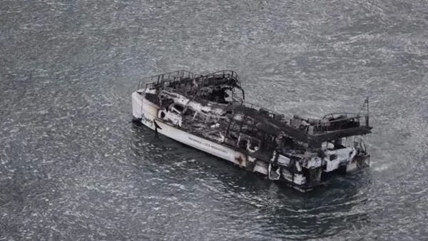 火灾破坏的不仅是陆地上人们的房屋和商店,大火掠过码头后,被烧毁的船只随着水流,飘向大海。