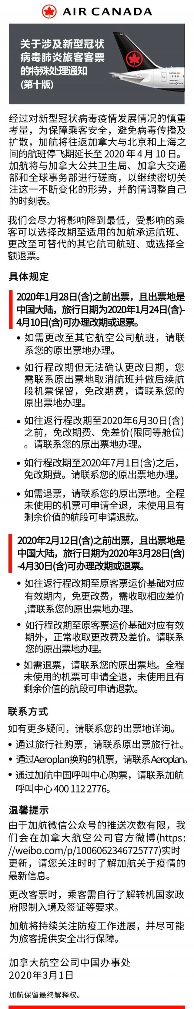 另悉,中国以外确诊病例现为9064例,治愈552,死亡140人。此外,针对涉及新型冠状病毒肺炎旅客客票,加拿大航空公司于昨日发布了特殊处理通知(第十版),详情如下: