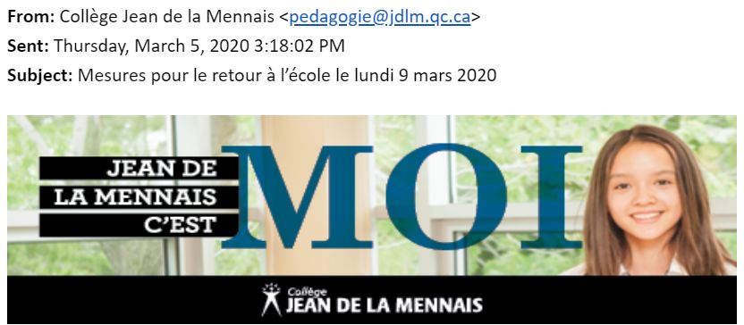 同时,如果您有家庭成员在近10日内去过COVID-19病毒影响中的中国、伊朗及意大利北部,请联系校方 (myrer@jdlm.qc.ca),以便我们采取相关行动。