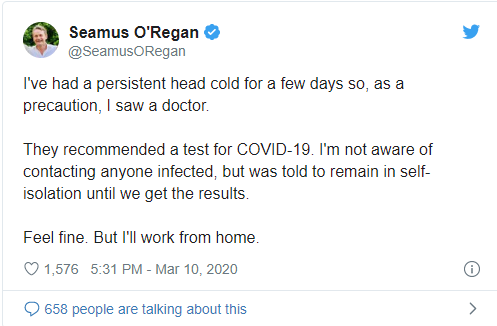 与会的还有联邦自然资源部长Seamus O'Regan。他昨天发推特说,他已经“持续感冒了几天”,目前正在自我隔离。