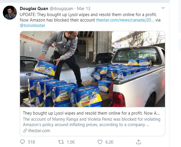 是的,这对夫妇一点儿都不害臊,他们为自己发现这个赚钱的机会感到很自豪。到被记者撞见时,他们已经赚了大约3万加元。6桶一包的消毒湿纸巾在Costco卖20加元一包,他们在网上先是卖75加元,后来涨到89加元。但无奈地说,这样做在加拿大并不违法。但是加拿大消费者委员会呼吁大型连锁店采取防止措施,并呼吁政府参考美国某些州的紧急状态法加强监管。是的,特殊时期,总得有些特别措施或监管!另外,法律之外还有道德…此事被《多伦多星报》曝光后,Costco和Amazon(亚马逊)先后吊销了他们的会员资格。亚马逊的声明说,该公司不会容忍哄抬价格的行为。