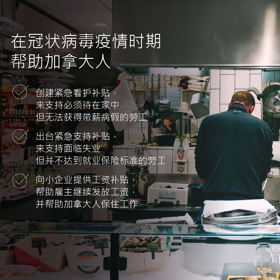 我们的护士与医生正在前线努力,工人们正在填满超市的货架。他们需要您做出正确的选择。他们需要您做出您应该做的部分。 我们将开始联邦政府资助的广告计划。您将会看到您知道并信任的人们,来自于我们的文化界的人士,向公众传播来自我们医护人员的建议。没有听到过我们的信息,将不会再是一个合理的借口。加拿大奥运代表队与残奥会代表队已经做出了艰难的决定,他们不会将运动员送往今年夏天的奥运会与残奥会。我知道这让许多人心痛——运动员、教练员、工作人员、以及体育迷们。但这是绝对正确的决定,每个人都应该遵循他们的脚步。不论您是谁,您需要做出您该做的事情。我想要对您表示感谢。您是拯救生命的英雄。 当事情变得更加艰难的时候,您的政府将会为您提供帮助。在上周三,我们出台了 820 亿加元的计划,帮助受到影响的个人和企业。如果您担心自己无法负担日常开销,我们将会为您提供更多资金。如果您拥有企业,我们将帮助您渡过难关。