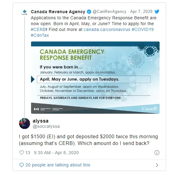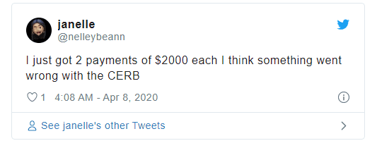 一名网友在推特上求助说:“我收到了两笔CERB补助,我该怎么把多出来的钱退回去?”