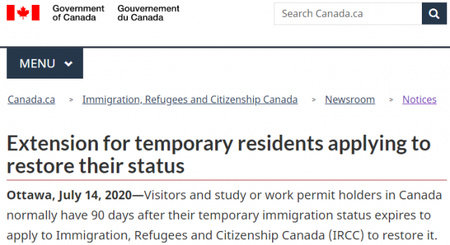 在原来的规定下,这些签证持有人(临时居民)在加拿大境内签证过期后,有90天的时间来向移民部提出签证恢复申请。但是,由于受新冠疫情影响,临时居民无法提供完整的申请信息,以及移民部也无法及时处理这些申请。而且,由于世界各地的航空旅行受到限制,许多临时居民很难找到回国的航班,比如受到“五个一”政策限制的中国人。因此,加拿大移民部实施了一项新的公共政策,延长了适用于加拿大境内外国公民原本要在90天内申请恢复签证的期限。