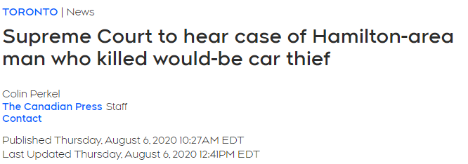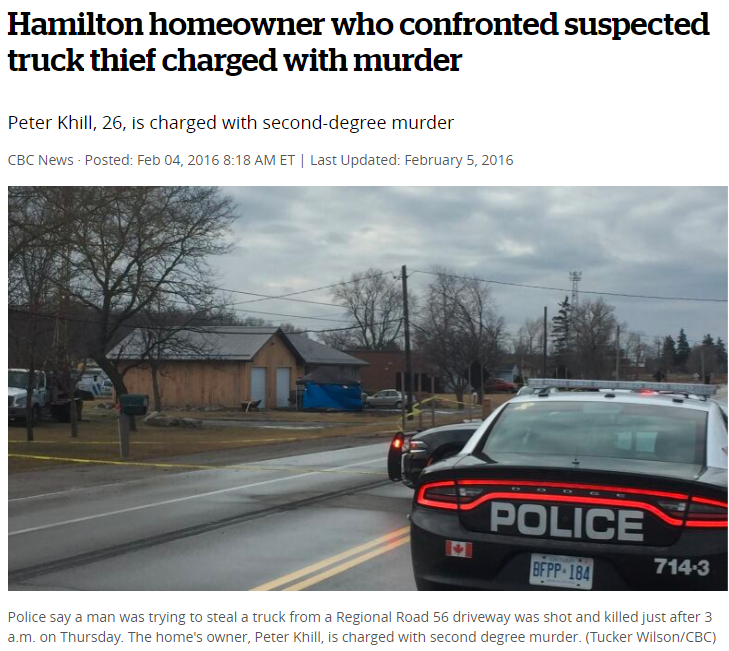 加拿大安省汉密尔顿地区的一名房主在深夜时分将一名进入家园企图偷车的人开枪打死后,案件一波三折。检方控以二级谋杀罪,辩方认为属于正当防卫,相持不下。昨日(8月6月),该案提交加拿大最高法院审理,由于最后的判决结果将对加拿大枪支自卫有重大影响,所以引起社会各界的高度关注。案件主角叫彼得·基尔(Peter Khill),一名前加拿大军队预备役人员,住在多伦多西南部哈密尔顿郊外地区。案件发生于2016年2月4日晚上,一名男子疑似到基尔的乡间住宅偷车。