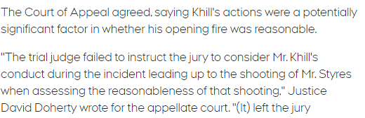当时只有26岁的基尔(Khill)为自己的辩护作证说,他当时别无选择,只能开枪自卫。基尔表示:“这是对现实的威胁评估。” “我感到自己受到威胁,感到无法控制局势。”因为在加拿大,允许一个人使用合理的武力以减轻对自己或他人的威胁。不过,控方上诉,指安省高等法院法官斯蒂芬·格利塞罗(Stephen Glithero)未能正确地向陪审团指示基尔在导致枪击发生的对峙角色。安省上诉法院表示同意,称基尔的举动可能是他开枪是否合理的潜在重要因素。上诉庭法官戴维·多尔蒂(David Doherty)写道:“初审法官没有让陪审团考虑清楚:基尔先生开枪的行为是否具有合理性” 此案起初具有种族色彩,因为被枪杀的斯泰尔是一名原住民,尽管没有证据表明基尔开枪时知道对方是谁。到底是合法自卫还是二级谋杀?最高法院将一锤定音,由于加拿大的法律系统是案例法,最高法院的判决将对以后类同案件有着重大影响。