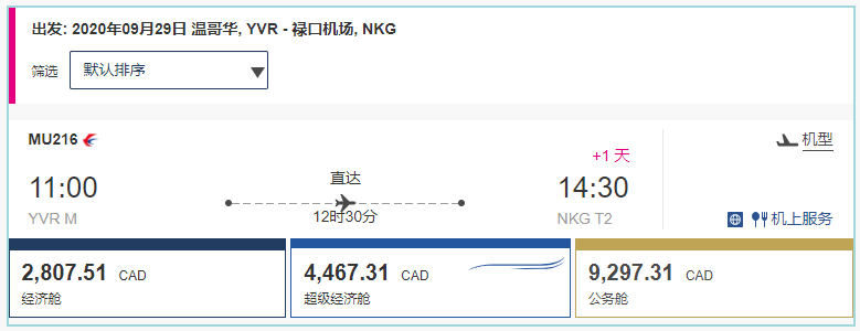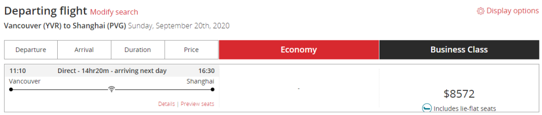 9月份,只有9月20日显示有商务舱,票价$8572,其它日期都查询不到或已经售罄,有需要的小伙伴们,具体可咨询加航客服。