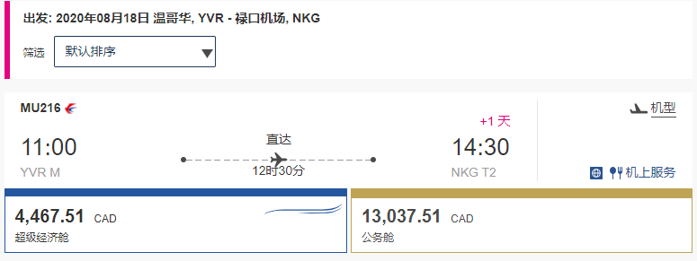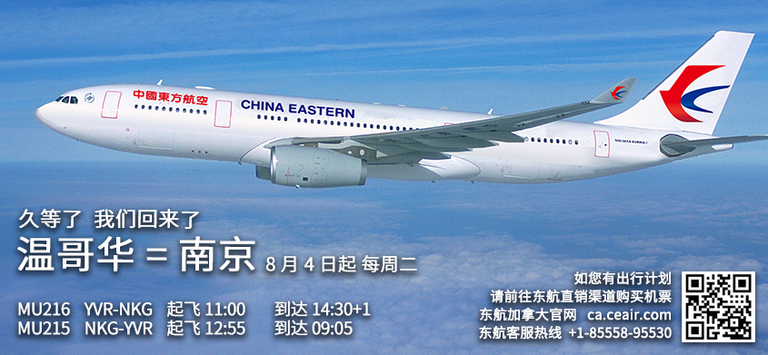 据了解,从8月11起,东航启用空客A350执行温哥华-南京奖励航班,将比之前机型更大、更舒适,重要的是由于飞机承载人数更多,又多出来一些余票,近期8-9月着急要回国的朋友可以来抢票了。
