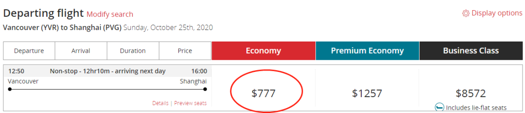 令人惊讶的是,10月25日,显示经济舱票价仅为$777,有计划回国的朋友真的可以下手了!