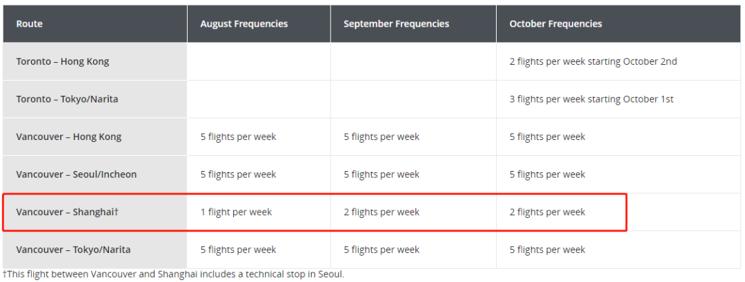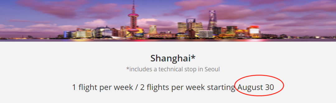 据加航官网信息,继8月7日成功复飞上海后,加航将从8月30日(每周日)起,每周增加一个班次,达到每周两班直飞上海(技术性停靠首尔)。9月与10月计划不变,仍是每周两班。