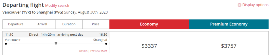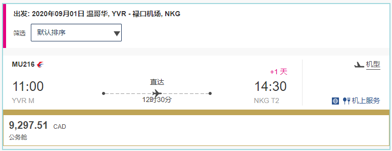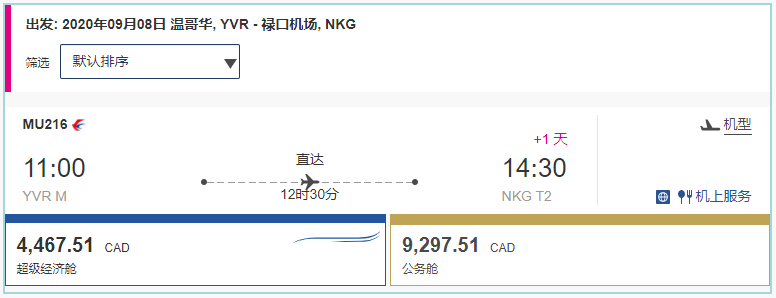 9月1日,经济舱已售罄,只有公务舱,票价$9297.51