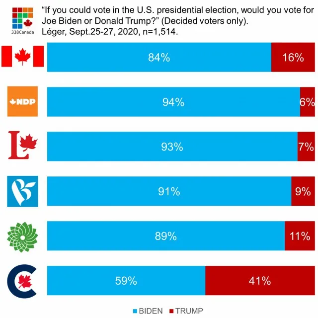 9月25至27日,新闻机构338Canada委托民调公司Léger发布网络问卷:“如果你可以在美国总统大选中投票,你会投票给拜登还是特朗普?”结果,在参与调查的1,514名加拿大人中,72%的受访者表示“将支持民主党候选人拜登”;只有14%的受访者表示“会投票给现任总统特朗普”;另有14%的人没有表态。排除未表态的受访者,即在所有已经作出决定的受访者中,拜登得票84%,特朗普为16%。从地区上看,除阿尔伯塔省有更多人愿意投票给特朗普外,其它各省都是一边倒,如果可以投票,那就选拜登:
