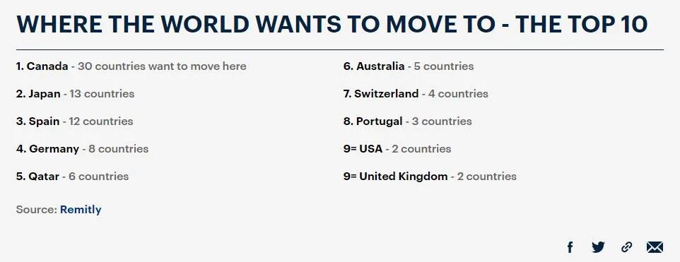 调研机构Remitly近日推出了一项名为《全世界想去哪里生活:世界最受欢迎的移民国家》的研究报告。数据显示,“加拿大”是全世界101个国家/地区的公民,最向往的“移民目的地”。