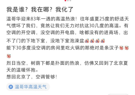 的确。一向温润如玉的温哥华,这几天简直就像是进入了火焰山模式。体感温度直接飙到摄氏50度,不仅比东部的多伦多、蒙特利尔等城市热,甚至比美国南方洛杉矶还要热!这百年不遇的高温热情似火,燃情程度分分钟简直可以把人融化。当然,更悲催的是,很多人家里根本就没有空调、甚至连台电扇也没有,面对大自然如此炙热直白的馈赠,连躲都没法躲,只能生抗……一些居民把门打开通风,没想到大熊趁虚而入,BC省自然保护部门表示,已收到三份熊进入高贵林、北温哥华和西温哥华房屋的报告。这些居民在抗暑的同时,还要抗熊……还有更恐怖的是,气象学家们预测:今后一段时间的天气,还会更加热!!!记忆中的温哥华,6月的平均气温在18度到21度左右,很少会低于15度或超过25度。白天不热,晚上还要盖被子,谁会想起来去买一台用不着的空调?这才是气候宜人的温哥华啊!想当初不知有多少人就是冲着迷人的气候选择了这座城市,可如今在热浪中翻滚,相信很多人一定会别有一番滋味在心头……