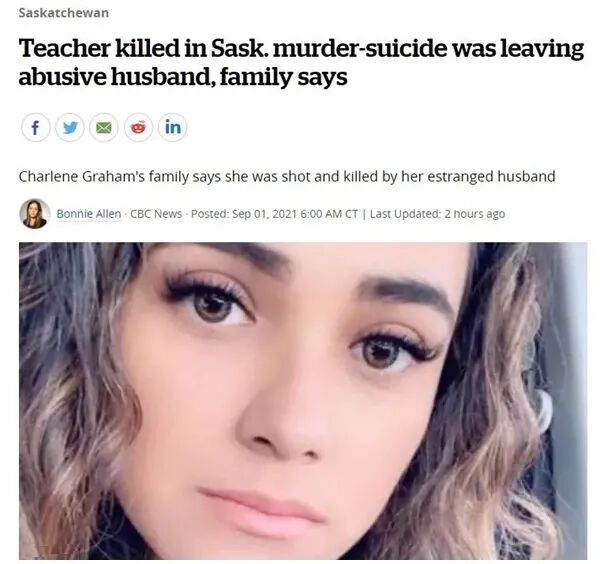 据报,8月30日下午,女教师Charlene Graham在萨省小镇Meadow Lake露营地死亡。Charlene的妹妹Duquette对媒体讲述了姐姐的悲惨人生——“杀死Charlene的是她的丈夫Delane Graham。他今年也是34岁,也是一名教师。大约一个月前,两人闹矛盾分居,丈夫Delane就跑到这处露营地居住。”“事发时,姐夫Delane看上去‘极端激动’,他用步枪对着我们……临终前,姐姐Charlene跟我说的最后一句话是:你快走!我没事……我要死了......”“他在我面前枪杀了姐姐,我当时害怕极了,我庆幸他没有在我逃离现场时朝我的后背开枪。”