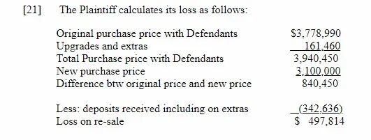 由于被告弃单,开发商不得不另寻买家。但内部装修已按个性化升级,成本上升加之品味独特,均导致买家不太好找。2020年新冠疫情爆发,大多伦多地区的房产销售一度停滞不前。直到2020年7月18日,原告才以$310万元的价格转售该屋。这一价格与原本价格相差极大。原告表示,减去被告已支付的$342,636元定金,还有$497,814元损失需要补上。