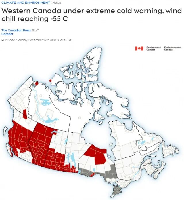 虽说冬天是加拿大的灵魂,但这灵魂……现在要疯。昨日,环境部发布“-55℃大范围极寒(Extreme Cold)警告”。