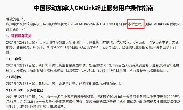 中国移动加拿大子公司在其官网登出的“终止服务用户操作指南”中表示,应加拿大联邦政府要求,中国移动加拿大子公司CMLink业务将于2022年1月5日起停止运营。指南称,自加东时间2021年12月28日起,该公司将停止新用户购卡、携号转入、CMLink一卡多号新申请、充值服务、套餐变更及补换卡。所有在2022年1月5日前未启用的SIM卡无法再启用。原有用户的主套餐将自2021年12月28日起,不再接受主套餐变更申请。截至2021年12月28日当天有效的套餐,到期后将获得免费续订,续订后的套餐将可继续免费使用至2022年3月31日。