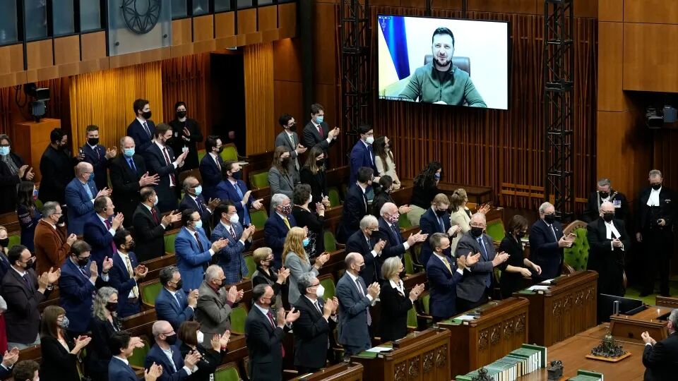 视频中,泽连斯基坐在乌克兰国旗前,身穿一件军绿色绒衣,他恳求加拿大国会(下议院)和参议院议员以及在场的高级官员、特别嘉宾见证他的讲话。泽伦斯基描绘了过去20天乌克兰面对的严峻挑战,他问加拿大人,“你们是否可以想象他们每天都会在城市大爆炸中醒来、人们不得不带着孩子逃到食物和水资源十分有限的防空洞中,那是一种什么样的体验?”“亲爱的贾斯汀,你能想象你每天都会收到有关伤亡人数的备忘录,包括妇女和儿童、你能想象有人在蒙特利尔或者其他加拿大城市中,扯下你的加拿大国旗吗?”在讲话尾声,泽连斯基说:“我们一直是你的朋友,贾斯汀。我希望你能理解并感受到我们每天的感受,以及我们对正常生活和胜利的渴望。”“你能想象吗?每当你打电话给你的朋友,你的同盟国时,你需要不停地请求——请在乌克兰设置禁飞区……而在真正做到这一点之前,乌克兰的城市又会迎来多少颗巡航导弹?”在加拿大国会,泽连斯基重申“要求北约国家在乌克兰设置禁飞区”——但截至目前,加拿大像其他盟国一样,拒绝了这一要求。理由是“那将被俄罗斯视为直接参战,引发战争一进步恶化”。泽连斯基演讲结束后,与会人员全体起立,热烈掌声经久不息。