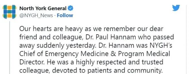 Hannam在多伦多东区也很有名,他曾在东约克的迈克尔加伦医院担任过两届首席急诊主任。医院在推特上写道,他曾担任我们的ED主任10多年,我们不会忘记他对我们医院和社区的巨大的贡献。他的几位前同事和患者也在社交媒体上表达了他们对这一损失的悲伤和震惊,并分享了对Hannam的回忆,他除了在NYGH工作外,还是多伦多大学家庭和社区医学系的助理教授。Hannam自2006年以来还担任过各种医疗领导和医院管理职务。