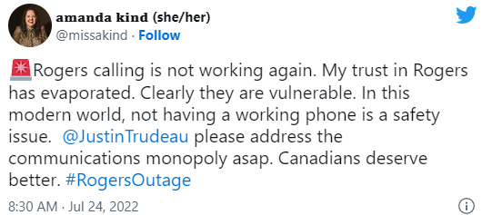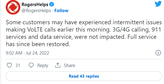 在出现Rogers全国大范围信号中断事件的几周后,于刚过去的周末又双叒叕中断了!不过这次面积较小,影响也小一些。7 月 24 日星期日,一些客户开始在推特上爆料无法拨打电话。Rogers随后在官方平台证实确实又有中断了,并称服务将在上午9点恢复。Rogers称,周日凌晨开始,一些客户可能再拨打VoLTE电话时遇到了间歇中断的问题。但此次中断不影响3G/4G 通话、911 服务或数据服务。这次影响虽小,但已经有了“狼来了”的效应,用户们在Twitter上通过“rogersoutage”的标签来表达着自己的不满,一度使这个标签冲上热搜。沮丧的客户表达了他们对无法再次拨打电话的不满。“我对罗杰斯的信任已经消失,”一位推特用户写道。一月多次中断,Rogers Communications Inc.公司在周天正式宣布,将在未来三年投资100亿元用于发展人工智能(AI)技术,同时还会做更多测试和监管。