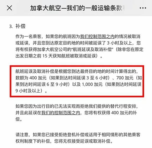 但根据加航官网条款,相关“航班延迟超过9个小时提供$1000加元赔偿”的这项索赔,只能由乘客个人提出申请。