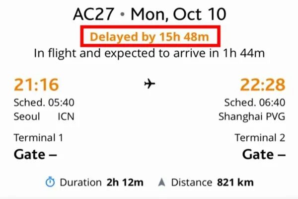 最后,这趟航班改成10月9日下午15:30起飞,比原定起飞时间延误了近16小时。