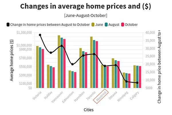 根据该网站收集到的数据:Victoria在10月份的平均房价降幅最大,所需收入也大大降低。上个月,Victoria地区平均房价为$915,300,压力测试通过率是7.44%,房贷利率是5.44%。在当地,购房者的年收入至少要达到$178,890,才能在首付20%的情况下供得起一套平均房价的房子。而这个年收入水平要求已经比8月份降了$4,810。温哥华仍然是加拿大房产最贵的城市。要在当地购买一套平均房价为$1,148,900的房子,购房者被要求的年收入为$220,700。多伦多10月平均房价比8月跌了$26,400,多伦多市购房者10月份被要求的年收入是$211,650,比8月的要求减少了2,300元,比6月的要求减少了14,850元。蒙特利尔10月平均房价比8月跌了$18,900,蒙特利尔市购房者10月份被要求的年收入是$105,330,比8月的要求减少了2,240元,比6月的要求减少了5,570元。报告还指出,虽然温哥华市是加拿大房价最高的城市,但几个月以来,该城市也是全国房价下跌最显著的地方之一。从报告中还可以看到,从8月到10月,Victora和温哥华的平均房价跌幅分别为$38,500和$31,600。