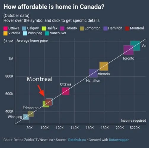 该网站的共同CEO James Laird展望表示,“由于可负担性仍在继续转好,我们将看到越来越多的潜在购房者会在明年开始找房。“我们也会看见卖家挂牌的价格会比高峰时期大大降低。”从上图可见,蒙特利尔的“平均房价”与“收入要求”都不算高,而转眼就是“明年”。好机会可要盯紧喽,不建议炒房哈,但该出手时便出手,想折腾的就折腾。