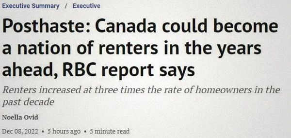 RBC报告称,尽管房主家庭仍以二比一的比例主导着加拿大的房地产市场,但租房者“来势汹汹”,其比例增加很快。加拿大从未有过如此多的租房者……报告称,仅过去一年,就有近500万户家庭出租了自己的房子,高于十年前的410万户。报告发现,在过去十年间,小城市的租房者增长更为强劲,达到22%,略高于大城市的21%。不过,报告也指出,“两者相差不大”也表明“居民负担能力问题并不以城市地区的大小而论……哪里都有,哪里的情况都差不多”。报告称,不断涌入的新移民、手里没钱的年轻一代、老人、独居者,是加拿大租房量激增的主要推动者。加拿大快速增长的移民目标,从2011年的25万人增加到2021年的40.1万人,极大地推动了租房需求。报告称,2018年,100万新移民中有56%(640,700人)住的是出租房。年轻一代正被负担能力问题困扰。比起前辈,现在的年轻人要晚几年才会买房。千禧一代(1981年至1996年出生)在买房之前通常要比婴儿潮一代(1946年至1964年出生)在同龄时多租3-5年房。人口老龄化也在推高租房需求,2021年记录显示,500万套出租房中有22%是65岁及以上的老年人,而2011年这一比例只有19%。报告称,婴儿潮一代(1946年至1964年出生)已超过千禧一代(1981年至1996年出生),成为2011-2021年间增长最快的租房群体。独居者是推高租房需求的重要因素。越来越多的加拿大人选择独居——去年,此情况已占到了所有家庭类型的近30%。早在2016年,“单身人士”便已成为“已婚夫妇”之外、加拿大最为突出的“家庭类型”。这些人中的许多人最终都会选择租房去住……因为在加拿大,拥有房屋的高成本通常需要两份收入……才能扛得比较舒服。现实中,许多旨在帮助首次购房者的计划似乎都收效甚微,加拿大房屋拥有率呈下降趋势,且这一趋势预计不会很快消失。这样下去,加拿大将变成一个“a nation of renters“(租房者之国)。