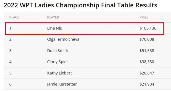 来自加拿大埃德蒙顿的38岁华人Lina Niu(音译:牛丽娜)周一在美国拉斯维加斯举行的“世界扑克巡回赛”中夺得女子组冠军,获得奖金超过10万美元($105,136 美元)。