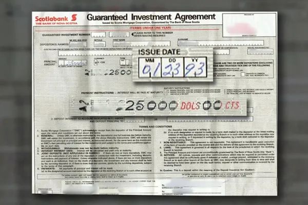 据CTV报道,家住士嘉堡的Mary Doria最近在打扫她家的房子。居然在家庭办公室里发现一张金额为$25,000元的定期存单(GIC)。29年前,Doria 在1993年从丰业银行购买了GIC。按照存款利率计算,Doria这张存单现在价值应该是118,103元。