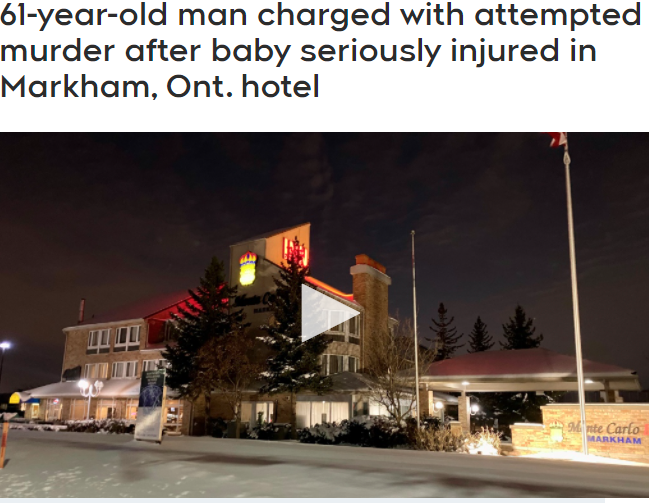 1月31日(周二)下午2点10分左右,警方接到报案后来到Woodbine Avenue与Hwy 7一带的一家酒店,调查一起年仅两个月大的婴儿的受伤案件。2月1日警方更新消息称,一名61岁的中国男子在现场被拘留。警方表示,这名男子被控谋杀未遂。