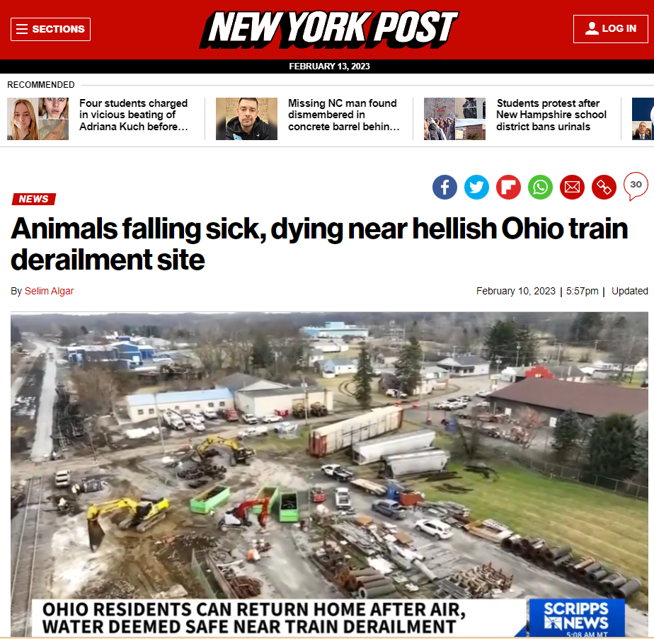 或许是因为刚开始“当地政府表示毒素水平已下降至安全水平”——俄亥俄州和宾夕法尼亚州政府声称,他们检测了附近的空气,发现毒素水平不会造成危险;俄亥俄州环保局也表示,虽然有毒素进入河道,但饮用水还是安全的。但几天后,越来越多的当地居民将图片和视频上传社交媒体,证明“事实并非如此”。附近的动物大量生病和死亡,无论是野生动物还是家养宠物,无论是陆地上的还是湖泊河流里的……