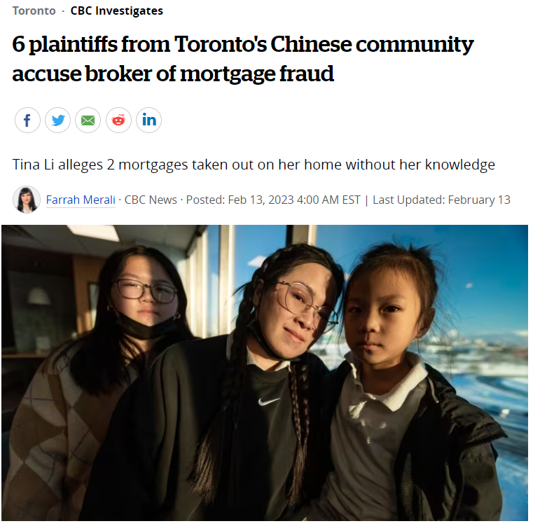 在此时,李女士已经与陈宝玉接触了了许久,认为陈是个“非常热心肠且诚实的人,甚至把陈当做家人一样。”2019年底,陈宝玉向李女士收集了“所需要的文件”,其中包括李女士的驾照,好几天都没有归还。随后陈宝玉还开车带着李女士去了好几个办公室签署文件,并告诉李女士他们需要开设一个联名银行账户。在银行,李女士说这些文件都是英文的,她看不懂--但她选择信任陈。“我真的是100%相信她,因为她总来我们家,和我的家人一起吃饭——我们都认为彼此是家人。”过了一段时间,陈宝玉告诉李女士她经纪公司的贷款已经获得了批准,抵押的款项--$330,151.73加元已被存入了她们二人的联名账户。但是,在一个月内,李女士说这笔钱被陈宝玉提走了,只剩下几百加币在二人的联名账户。几个月后,新冠疫情开始大流行,陈告诉李女士,银行贷款被 "无限期 "搁置了。李女士说,到了2021年春天,陈才告诉她贷款又开始进行了,要求李女士签署更多文件。李女士表示,这笔银行贷款从未被兑现。到了2021年9月,当李女士去续签她在万锦市的房子的房贷时,她震惊地得知自己的房子上多了两个额外的抵押贷款!她说她立即联系了陈,但陈告诉她这是她公司的一个 "错误",她会请律师解除抵押贷款。可是直到2022年6月,产权搜索证实这两笔抵押贷款仍然存在--一笔是在2019年11月登记的,价值$40万加元,另一笔是在2021年5月登记的,价值$39.2万加元。李女士表示:“当我搜到我的房产上居然背上了两个抵押贷款时,我立马崩溃了,感到害怕想哭。”更可怕的是,李女士还收到了一份关于她房屋出售权( power of sale)的通知,因为这两笔抵押贷款没有还款所以违约了,如果李女士不还钱房屋可能面临强拍。目前,李女士的律师正在努力采取办法,消除这两笔抵押贷款。在民事法庭文件中,李女士称这两份抵押贷款文件上的签名是伪造的,签名是被人冒充签下的。她已经提交了一份警方报告,现在正在处理这些事件--后果包括可能失去她的房子。李女士并不是唯一一个被经纪陈宝玉骗的人。多伦多总共有6名华人中招!CBC新闻在翻阅法庭资料时发现,在其他两个案件中,原告声称他们是在看到一份中文报纸上的广告后第一次与陈联系的。有三个原告都称自己一点都不会英文,陈宝玉利用了这一点,对他们歪曲了事实真相。有一位原告是一位退休人员,还是两次癌症的幸存者。她称自己和李女士一样,此前和陈先建立了友谊关系。