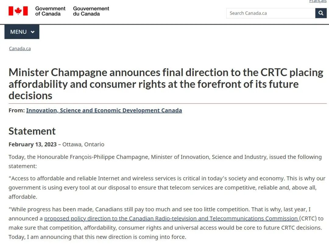 联邦政府实施的一项新的加拿大广播电视和电信委员会 (CRTC) 政策指令现已生效,这意味着CRTC必须做出优先改善加拿大电信行业竞争的决定。