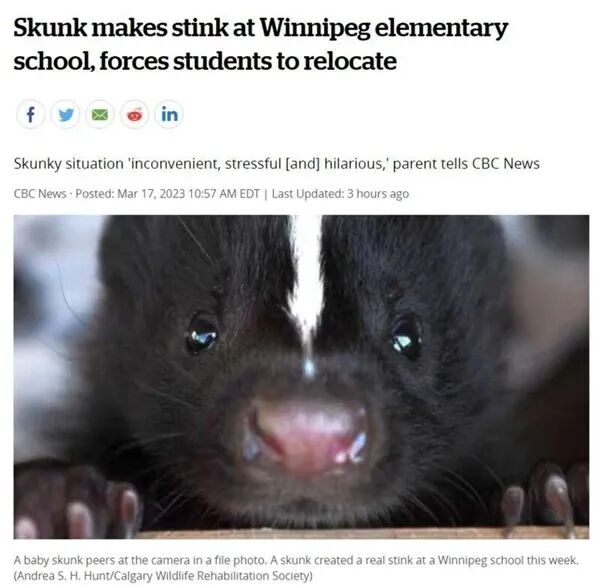 据CBC报道,撤离当晚,该校校长Jane Couch,副校长Norm Gould联名给家长发信称,“现已确认,教学楼内昨日飘荡的刺鼻气味是臭鼬的屁。该屁不含毒素,但我们知道,大多数人闻到后会感觉不舒服……”