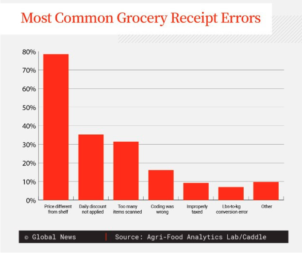 Dalhousie University农业食品分析实验室周二发布的最新报告显示,67%的加拿大人在过去一年中至少发现过一次杂货店账单上的错误。
