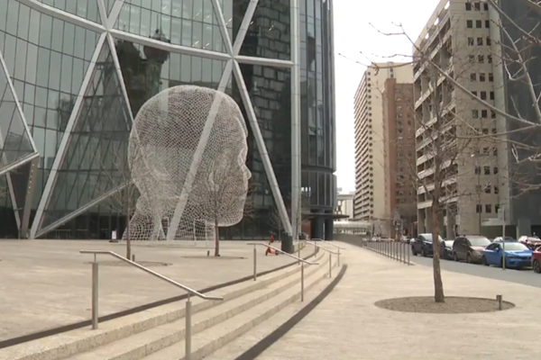 市中心最高塔 “The Bow” 入口处有一件名为“仙境”(Wonderland)的公共艺术品,高约12米,是用金属网等材料弯曲而成的“女人头部”,作者是著名的西班牙雕塑家Jaume Plensa。由于所处地理位置,该作品极具地标性。大多数人都管这里叫做 “市中心的大头”。Lau大师对同行的卡尔加里华裔市议员Terry Wong反复强调:“地上的头是不详预兆……人头落地是一个非常非常不好的预兆。”Lau大师指出:“就在这件艺术作品于2013年揭幕的几个月后,卡尔加里市中心就被洪水淹没了。”