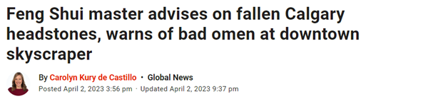 “此前,为了不扰乱个别墓地的原有风水,那些损坏或倒伏的墓碑就没有被修复,而是由相关人士筹资,新建了一个共同的墓碑(纪念碑)……”Lau大师给出的建议是:“将石头摆正,使其整齐笔直,因为墓碑代表着祖先后代的健康。如果石头是直的,它就代表健康。”Lau大师还指出,卡尔加里还有另一个风水问题需要解决。