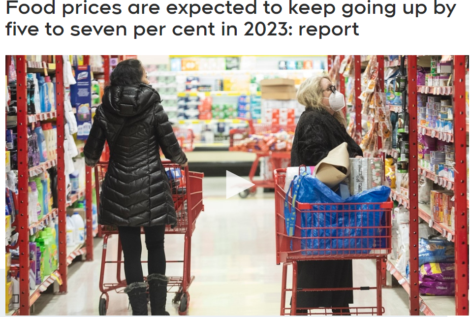 一份新报告警告称,食品通货膨胀将继续推高物价,尽管涨幅比去年有所放缓,但一个四口之家2023年的食品支出仍将增加大约1000元。这份由达尔豪斯大学、圭尔夫大学、萨斯喀彻温大学和UBC大学的研究人员编制的《加拿大食品价格报告》显示,食品价格在2022年增长超过10%之后,2023年将再上涨5%至7%。