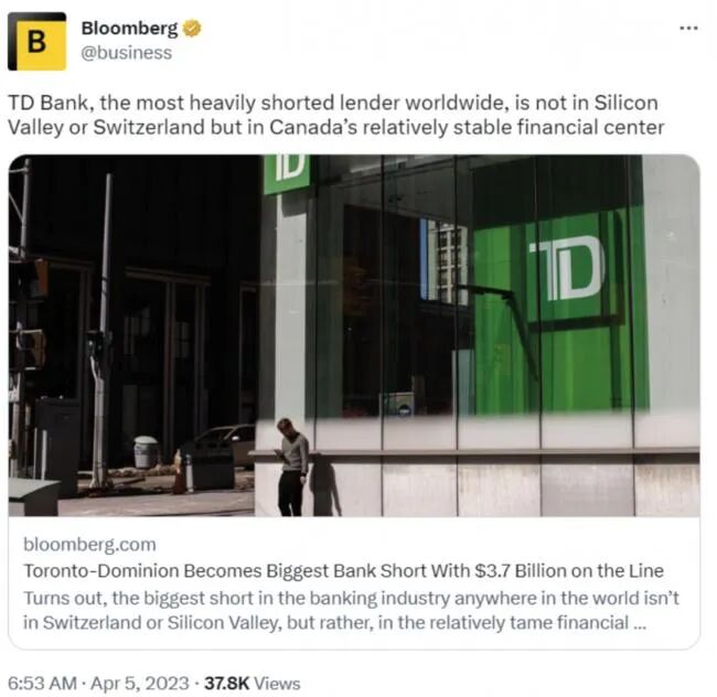 彭博社报道称,数据显示,全球被最多人看空的银行不在欧洲,也不在硅谷,而是位于相对平静加拿大。总部位于多伦多的TD Bank被认为是全球做空规模最大的银行。