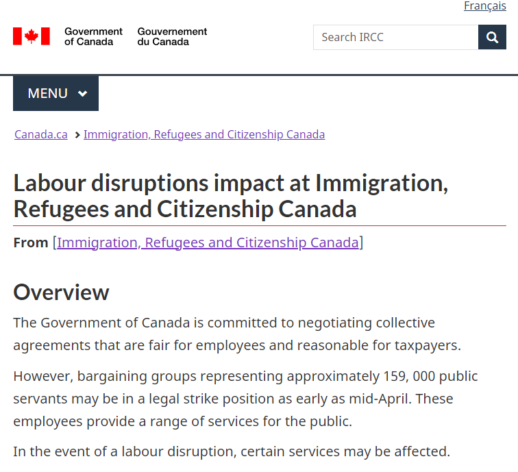 就在加拿大税局宣布将在4月14日罢工后,加拿大移民部(IRCC)也发布新闻稿,称“公务员可能最早于4月中旬举行罢工,将影响到移民部审批签证等一系列服务”。新闻稿称,加拿大政府致力于谈判对员工公平、对纳税人合理的集体协议。此前,代表大约15.9万名移民部员工的工会组织表示,为公众提供一系列服务的雇员可能最早会在4月中旬便处于合法的罢工状态。