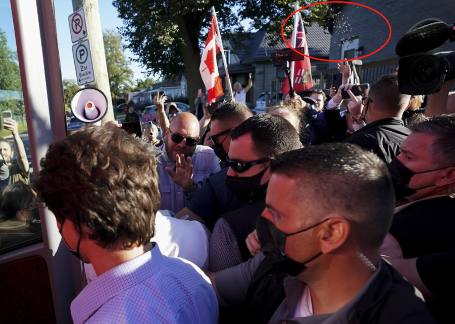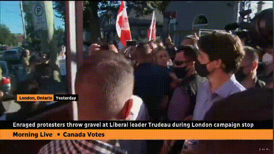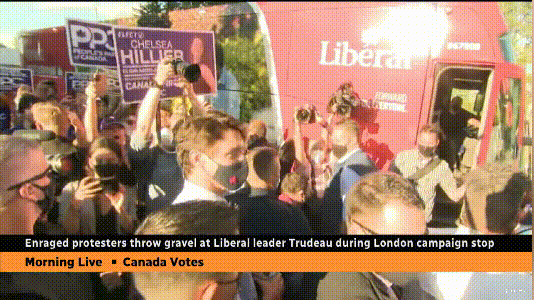 2021年9月6日,特鲁多在安省伦敦参加竞选活动。在其即将登上大巴前,一大群“反对在疫情中戴口罩”的抗议者围了过来,有人在人群之中突然出手,向特鲁多及其安保人员抛撒石子。