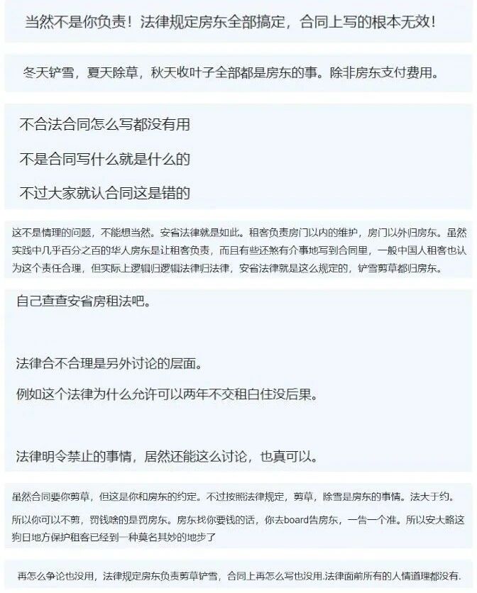 还有一些人指出“很多房东根本不懂法”……实际上,安省法律规定“除草铲雪都是房东的责任”,即使合同上写了也是无效的——一栋房子因为不除草被投诉,最终被罚的会是房东。