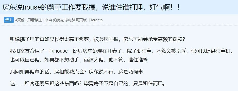帖子写道:“房东说house的剪草工作要我搞,说谁住谁打理,好气啊!!”