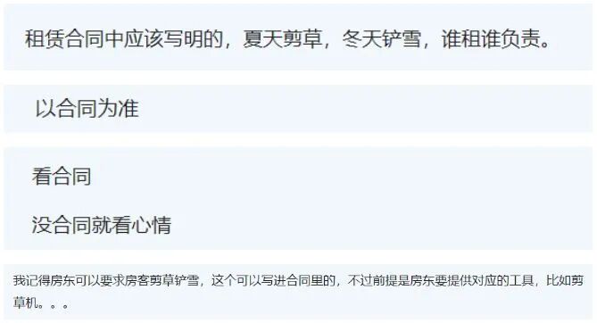 有人则表示,当以租房合同为准。合同中应该写明夏天剪草,冬天铲雪由谁负责。